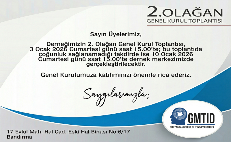 Güney Marmara Teknoloji ve İnovasyon Derneği’nin 2. Olağan Genel Kurul Toplantısı, 3 Ocak 2026 Cumartesi günü saat 15.00’te dernek merkezimizde (17 Eylül Mah. Hal Cad. Eski Hal Binası No:6/17 Bandırma) yapılacaktır.